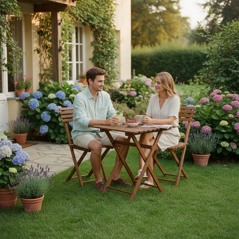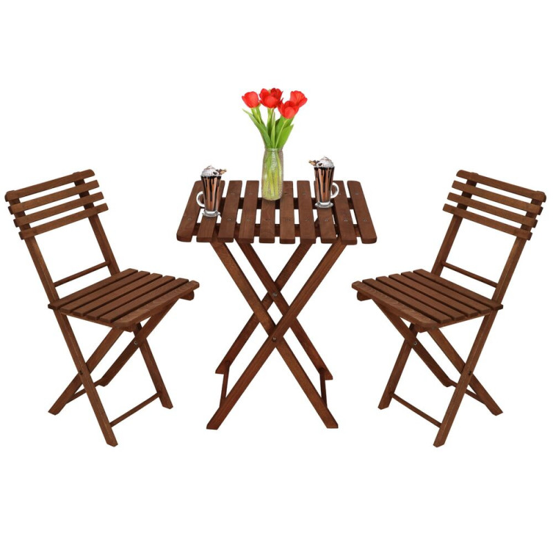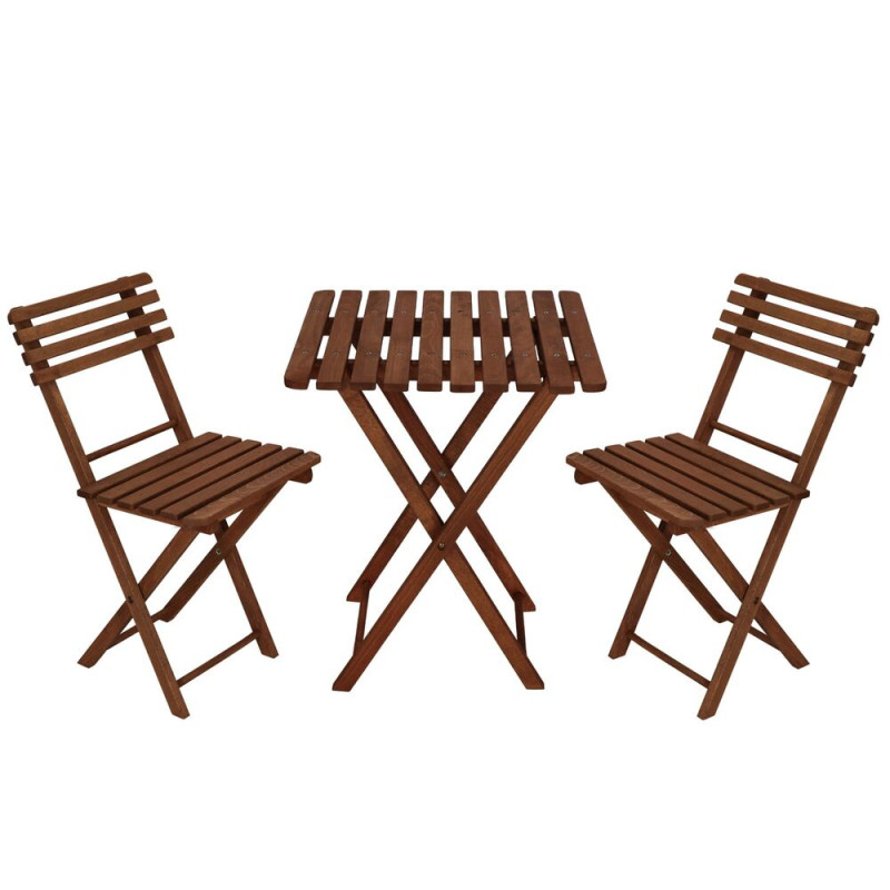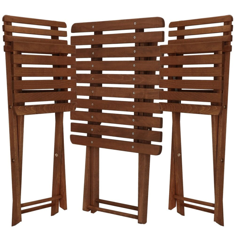 Elegantní set dřevěného nábytku stůl a dvě židle, ideální pro menší prostory a balkony. Vyrobeno z pevného bukového dřeva s ochrannou tmavě hnědou lazurou, která zajišťuje vysokou odolnost vůči povětrnostním vlivům. Díky praktickému skládacímu provedení se snadno přenáší a uskladňuje. Vhodné pro venkovní použití. Nosnost židle 125 kg, stůl 30 kg.