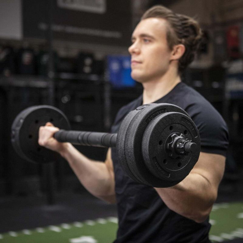 Součástí sady jsou kotouče o hmotnosti 1 kg, 1,25 kg a 2,5 kg, které umožňují jemné i výraznější navyšování zátěže. Pomocí spojovacího konektoru lze dvě jednoruční činky jednoduše přeměnit na obouruční variantu. Konektor s měkčenou pěnou zajišťuje pohodlný úchop a chrání ruce před otlaky i při delším tréninku.