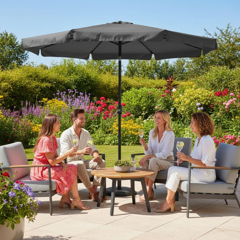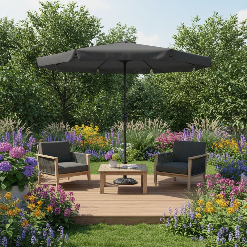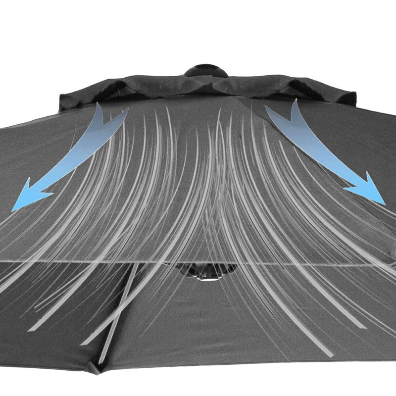 Slunečník je vyroben z nepromokavé tkaniny s UV filtrem, která chrání před sluncem i lehkým deštěm. Horní odvětrávání zajišťuje lepší cirkulaci vzduchu. Stabilní konstrukce a klikový mechanismus umožňují snadné ovládání a dlouhodobé používání.