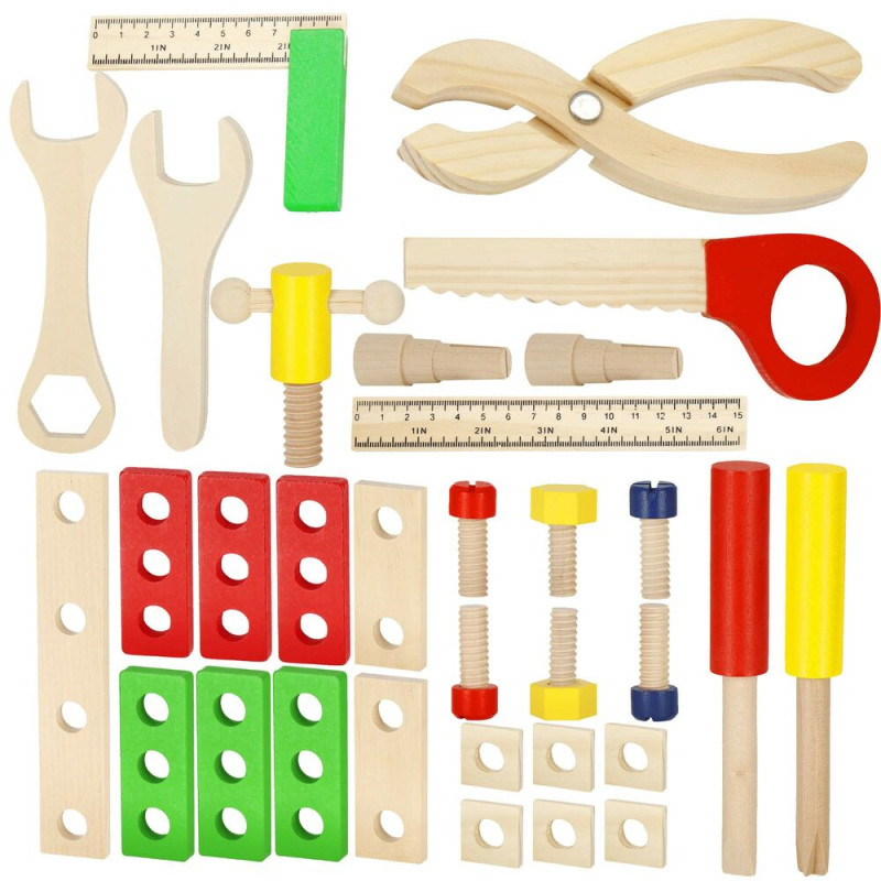 Dřevěná sada nástrojů pro děti bude skvělou zábavou na dlouhé hodiny. Sada obsahuje velké množství nástrojů, které podněcují děti k další činnosti. Sada podporuje manuální dovednosti, kreativitu a logické myšlení. Nástroje mají správnou velikost a díky tomu bude manipulace pro děti velmi snadná a příjemná.
