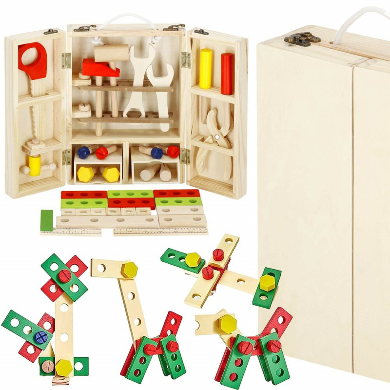 Sada dřevěných nástrojů v kufříku pro všechny malé kutily. Vyrobeno z kvalitního dřeva, dlouhá životnost. Nástroje mají správné rozměry, vhodné pro malé ruce dětí. Certifikovaný výrobek. Sada podňecuje manuální zručnost, fantazii a kreativitu.