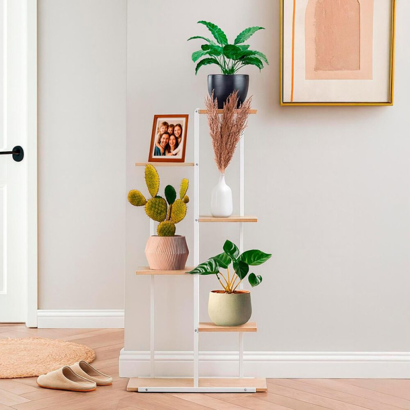 Díky šesti praktickým úrovním nabízí dostatek prostoru pro různé velikosti květináčů, dekorací i drobných doplňků. Stabilní kovová konstrukce poskytuje spolehlivou oporu, zatímco pevné police s příjemným povrchem vytvářejí bezpečné místo pro vaše rostliny. Konstrukce působí lehce, přesto je navržena pro dlouhodobé a bezpečné používání v každodenním provozu domácnosti.