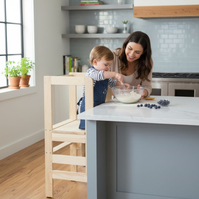 Dětská učící věž DECHLAND LEARNING přírodní umožňuje dětem bezpečně se zapojit do každodenních činností v kuchyni i domácnosti. Slouží jako praktická rostoucí stolička typu Kitchen Helper, která podporuje samostatnost, rozvoj motoriky a přirozenou zvídavost dítěte už od útlého věku.