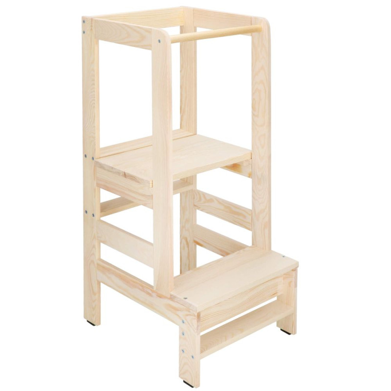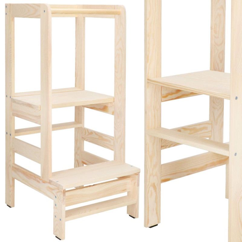 Věž roste spolu s dítětem a nabízí nastavení výšky ve 3 stupních (19,5 / 32,5 / 50,5 cm), takže ji snadno přizpůsobíte aktuální výšce dítěte. Konstrukce z kvalitního borovicového dřeva má pečlivě zabroušené hrany a stabilní bezpečné provedení, které zajišťuje jistotu při každodenním používání.