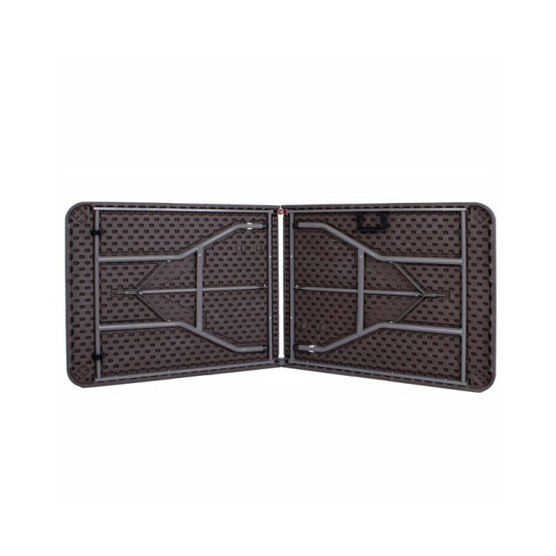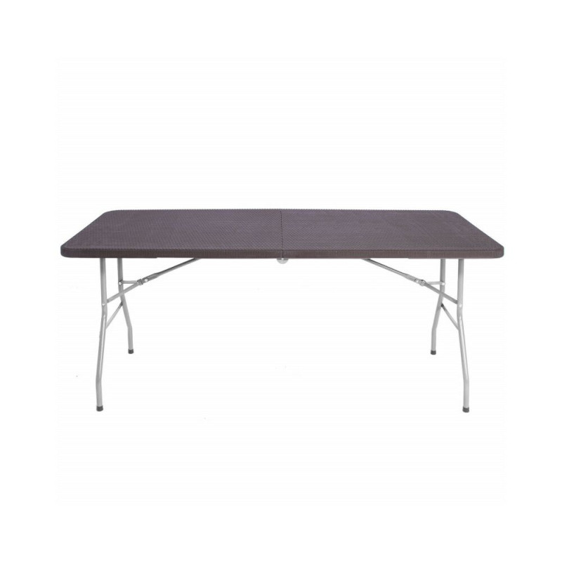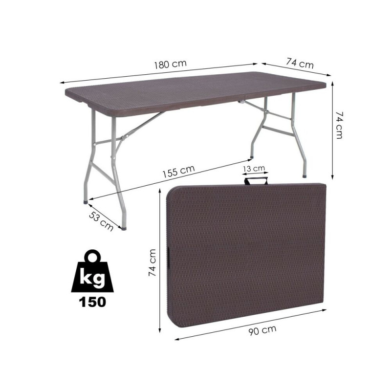 Stůl je vyroben z materiálů odolných vůči povětrnostním podmínkám, což umožňuje jeho využití i ve venkovním prostředí. Skládací provedení s praktickým zámkem proti samovolnému složení a pohodlnou rukojetí usnadňuje manipulaci i přepravu – po složení se snadno vejde do kufru auta. Snadná údržba a univerzální hnědá barva s ratanovým vzhledem z něj dělají funkční a estetický doplněk pro každou příležitost.