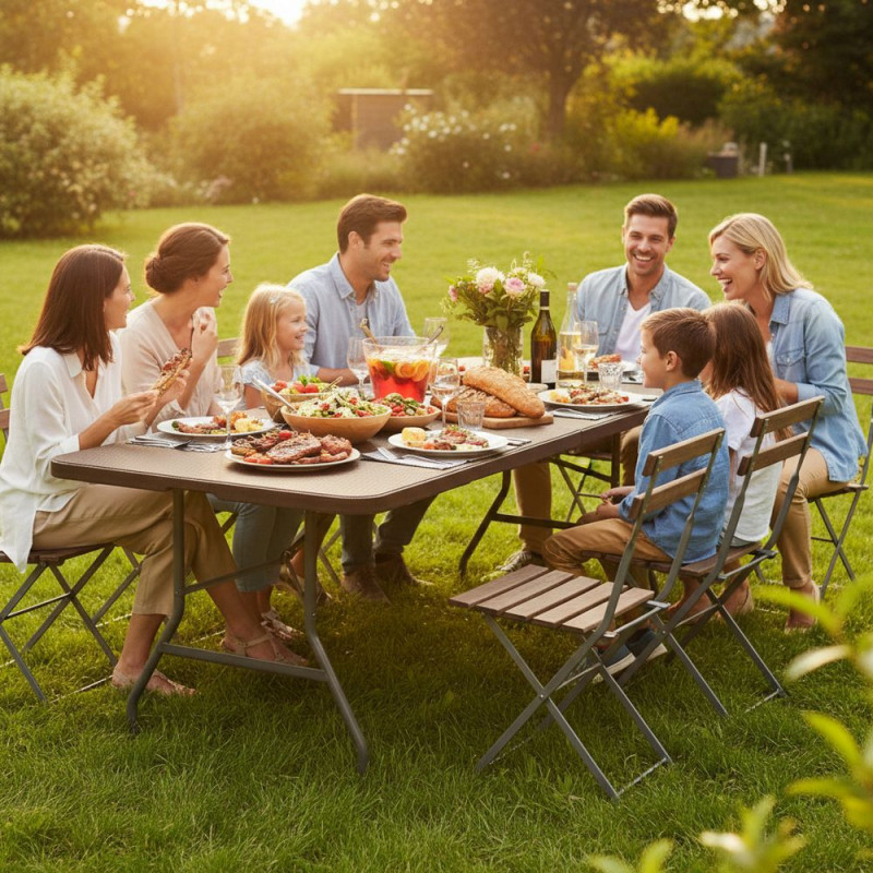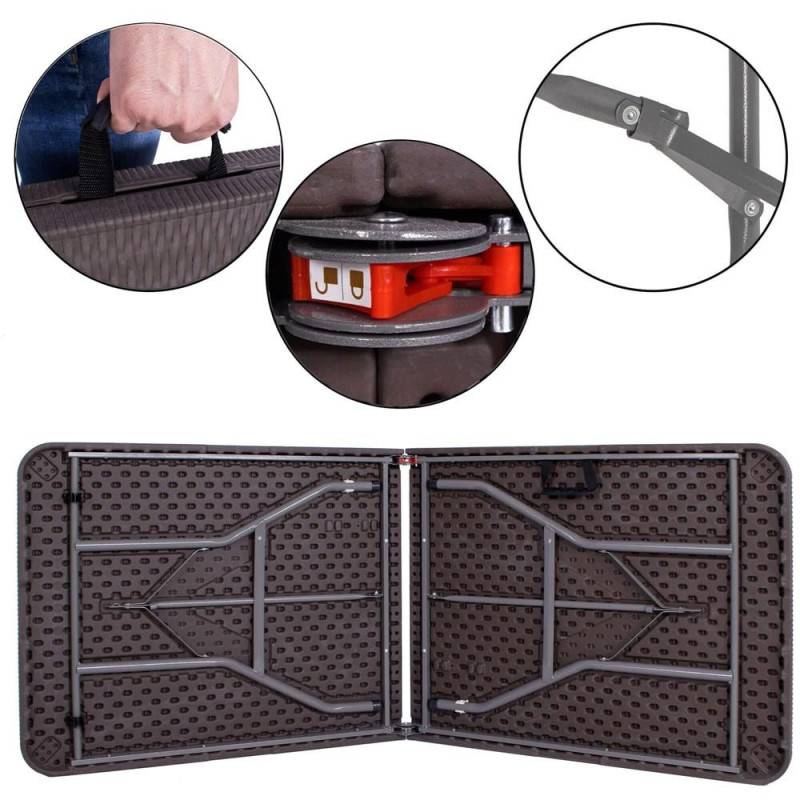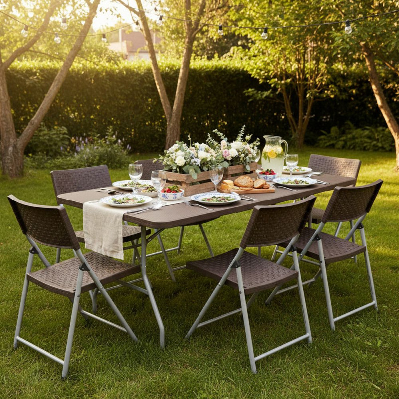 Prostorný skládací stůl ideální pro rodinné oslavy, bankety a společenské akce. Nabízí prostornou plochu pro až 8 osob, ratanový vzhled desky stolu, nosnost 150 kg a stabilní konstrukci s bezpečnostním zámkem proti složení. Je odolný vůči povětrnostním vlivům, snadno se udržuje a lze jej složit do kompaktního kufru s rukojetí pro pohodlné přenášení. Rozměry 180x74x74 cm (dxšxv).