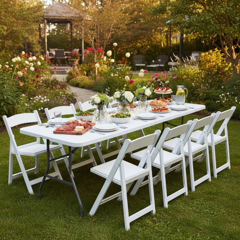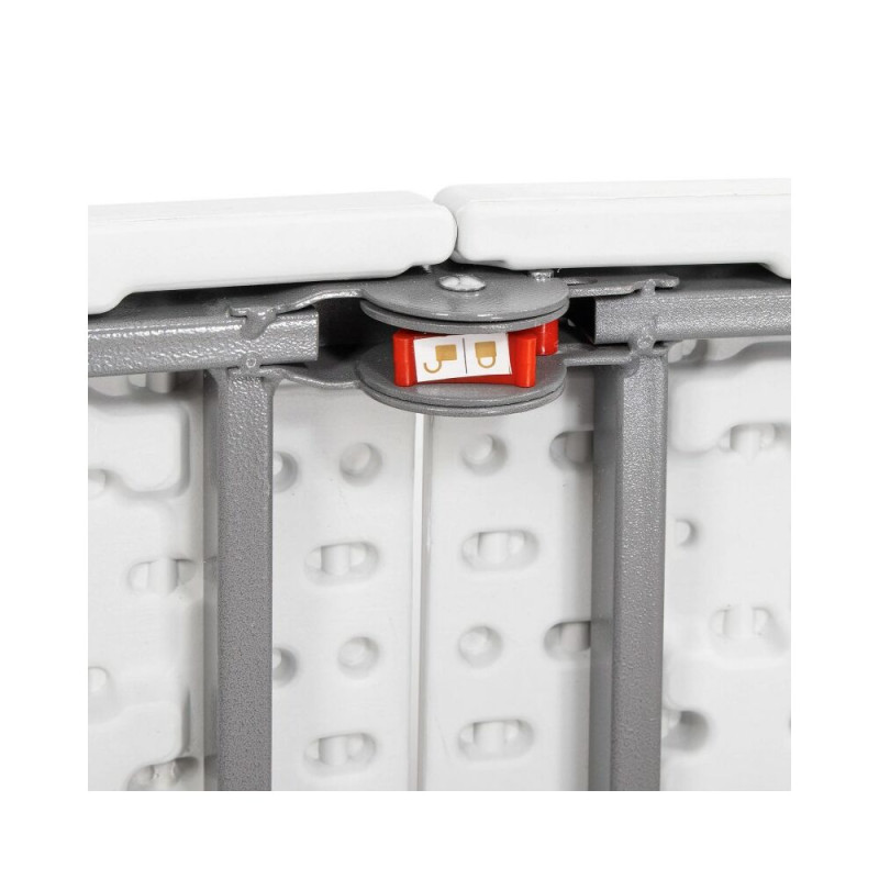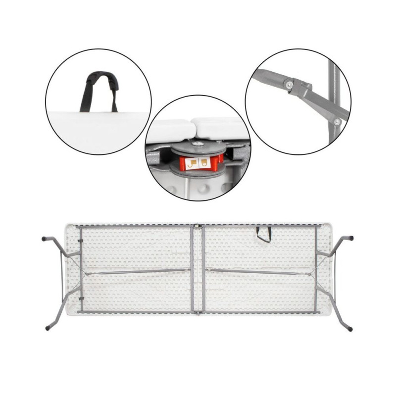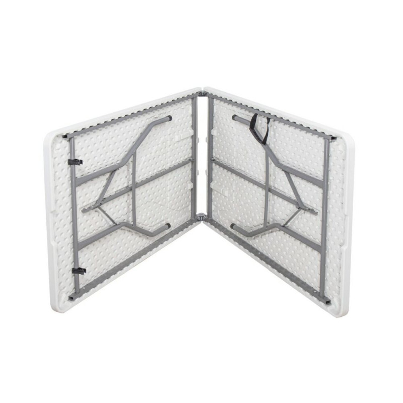Stůl je vyroben z materiálů odolných vůči povětrnostním podmínkám, což umožňuje jeho využití i ve venkovním prostředí. Skládací provedení s praktickým zámkem proti samovolnému složení a pohodlnou rukojetí usnadňuje manipulaci i přepravu – po složení se snadno vejde do kufru auta. Snadná údržba a univerzální bílá barva z něj dělají funkční a estetický doplněk pro každou příležitost.