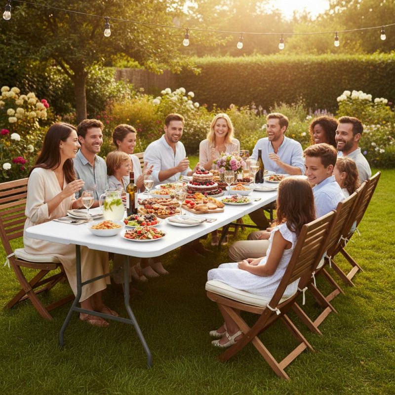 Velký skládací stůl ideální pro rodinné oslavy, bankety a společenské akce. Nabízí prostornou plochu pro až 12 osob, nosnost 150 kg a stabilní konstrukci s bezpečnostním zámkem proti složení. Je odolný vůči povětrnostním vlivům, snadno se udržuje a lze jej složit do kompaktního kufru s rukojetí pro pohodlné přenášení. Rozměry 240x75x75 cm (dxšxv).