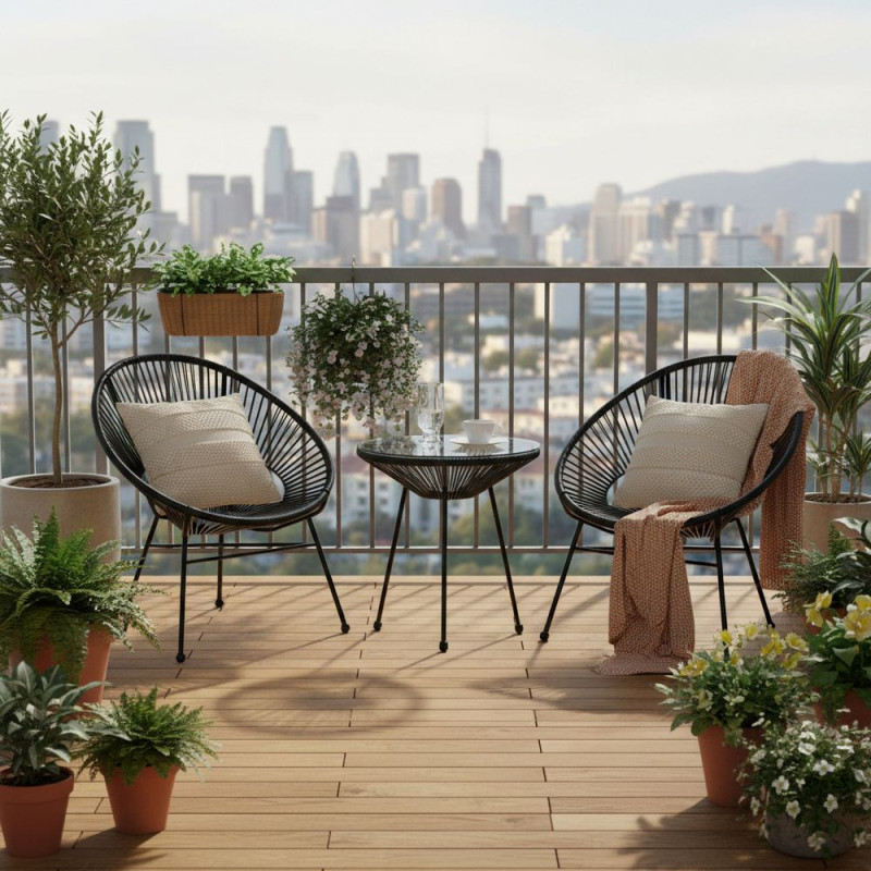 - Materiál: PE ratan, kov, tvrzené sklo