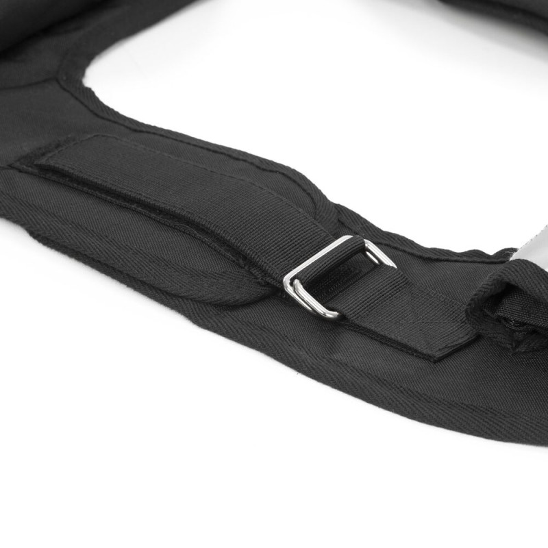 Součástí je 6 vaků s litinovými kuličkami, z toho 3 vpředu a 3 vzadu, což zajišťuje rovnoměrné rozložení hmotnosti a stabilitu při pohybu. Díky pevnému a bezpečnému uchycení drží vesta spolehlivě na těle i při intenzivním tréninku bez nežádoucího posouvání.