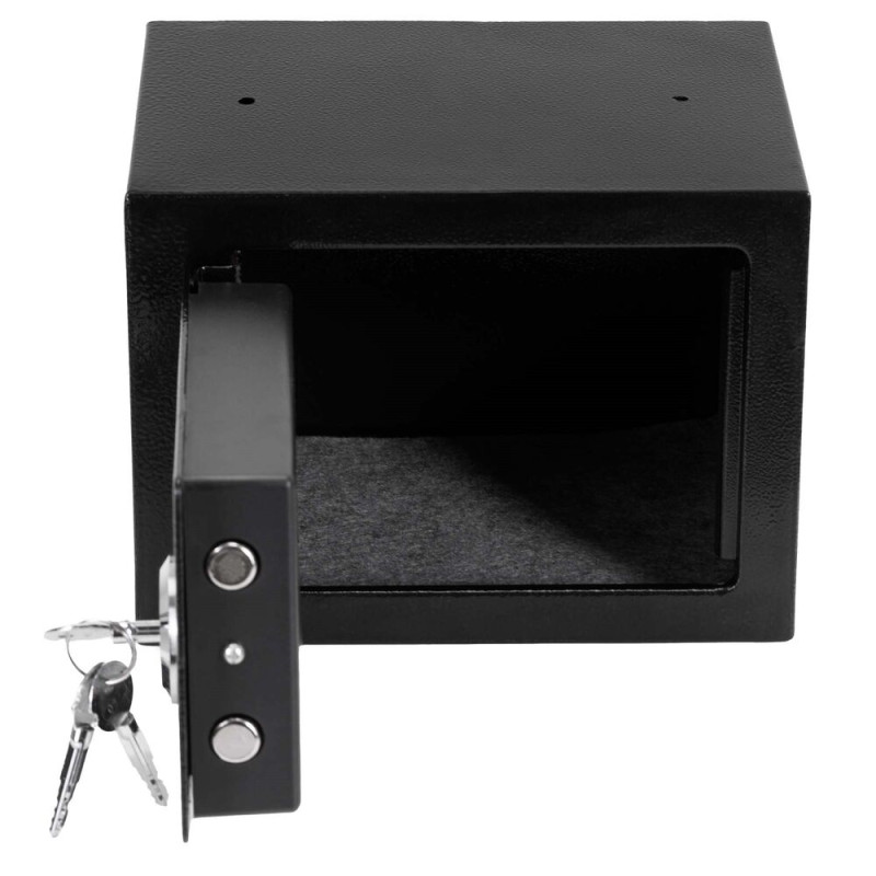 Kompaktní kovový trezor slouží k bezpečnému uložení klíčů, drobných cenností nebo dokumentů. Pevná konstrukce s práškovým nástřikem zvyšuje odolnost proti poškození, zatímco mechanický zámek se třemi klíči zajišťuje spolehlivé uzamčení. Vnitřní prostor je opatřen plstěnou podložkou a možnost montáže na zeď nebo podlahu zvyšuje úroveň zabezpečení.