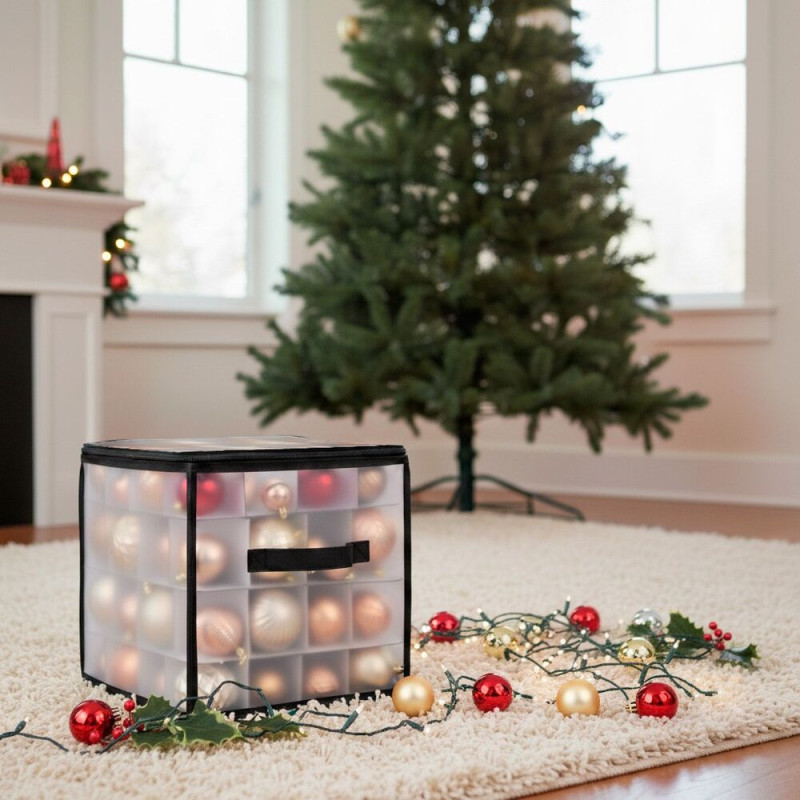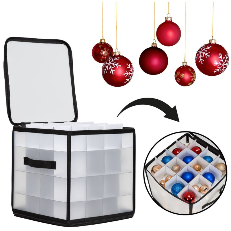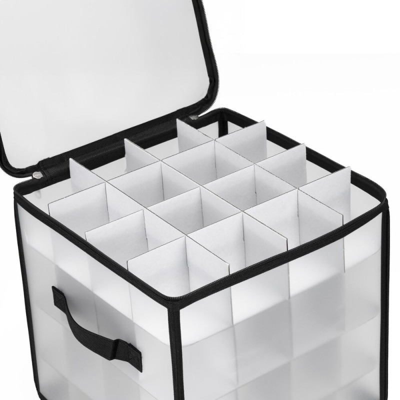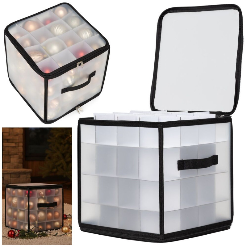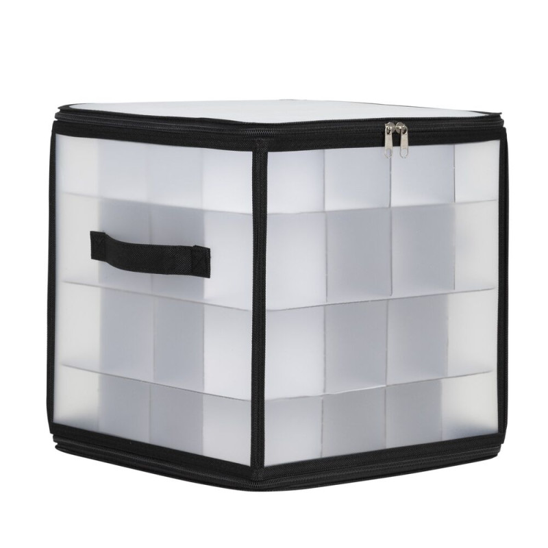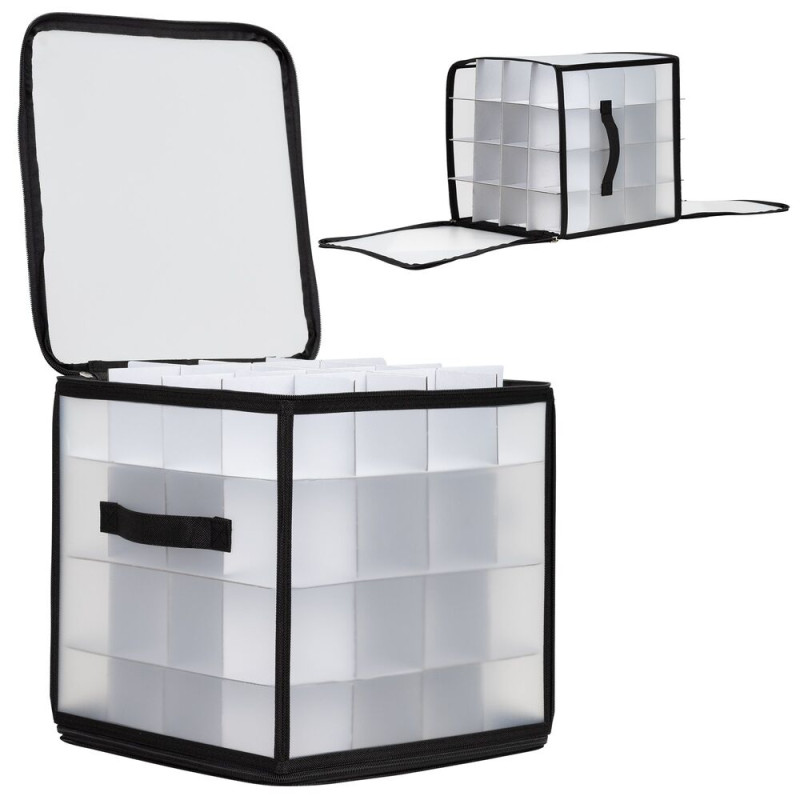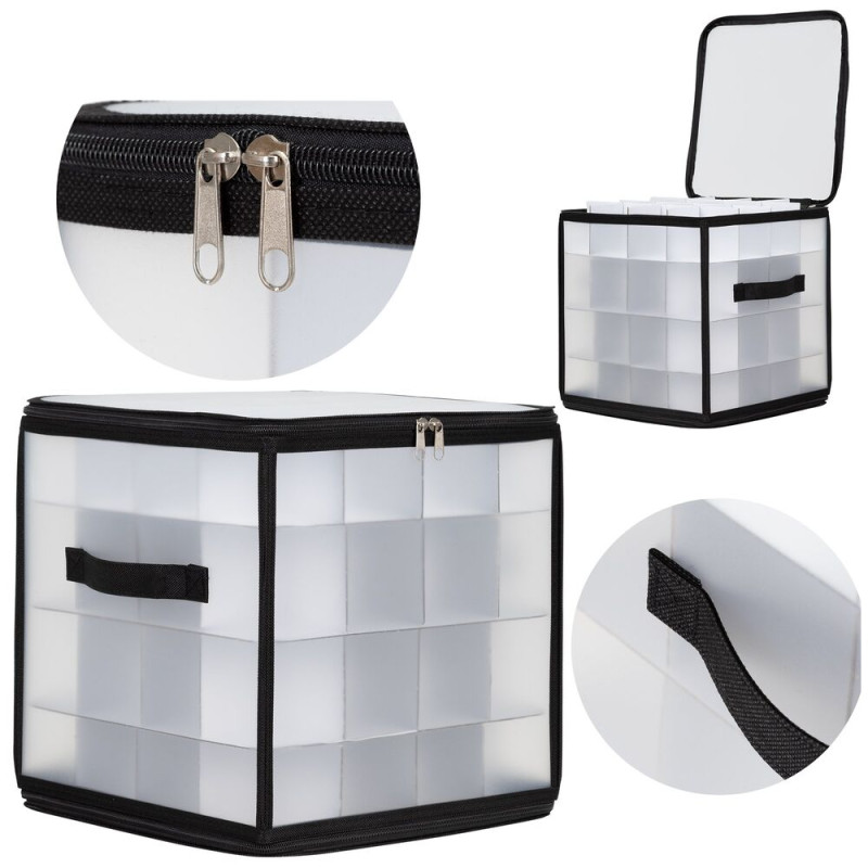 Praktický úložný box s průhlednými stěnami umožní přehledně a bezpečně uložit až 64 ozdob či drobností. Díky 4 úrovním a samostatným přihrádkám máte vše perfektně roztříděné. Organizér se uzavírá zipem na dvou stranách, je vybaven dvěma pevnými hliníkovými rukojeťmi a spodními suchými zipy, které brání posunu při převozu. Po složení zabírá minimum místa a snadno se skladuje.