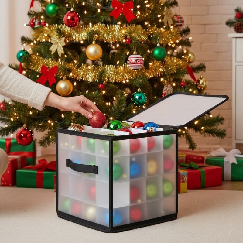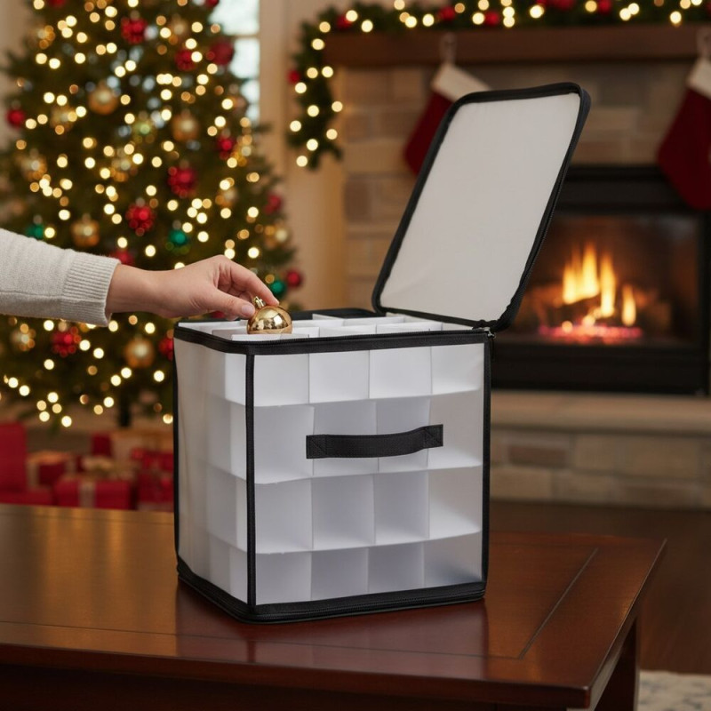 Úložný box na vánoční ozdoby 30 × 30 × 30 cm je praktické řešení pro bezpečné a přehledné uložení vánočních ozdob či jiných drobností. Průhledné stěny umožňují okamžitou kontrolu obsahu a čtyři úrovně s celkem 64 přihrádkami udrží vše pečlivě roztříděné. Díky dvoucestnému zipu se organizér snadno otevírá a zavírá, zatímco pevné hliníkové rukojeti zajišťují pohodlné přenášení. Praktickým benefitem jsou také spodní suché zipy proti posunu, které zvyšují stabilitu při převozu.