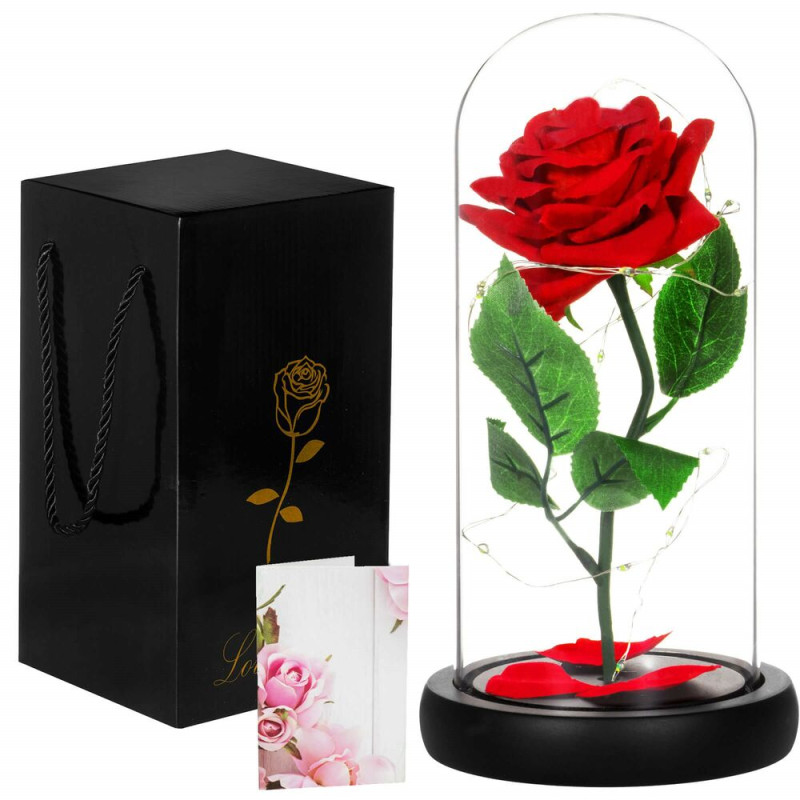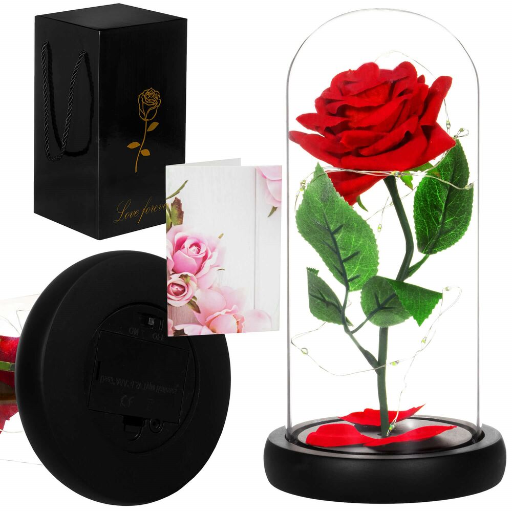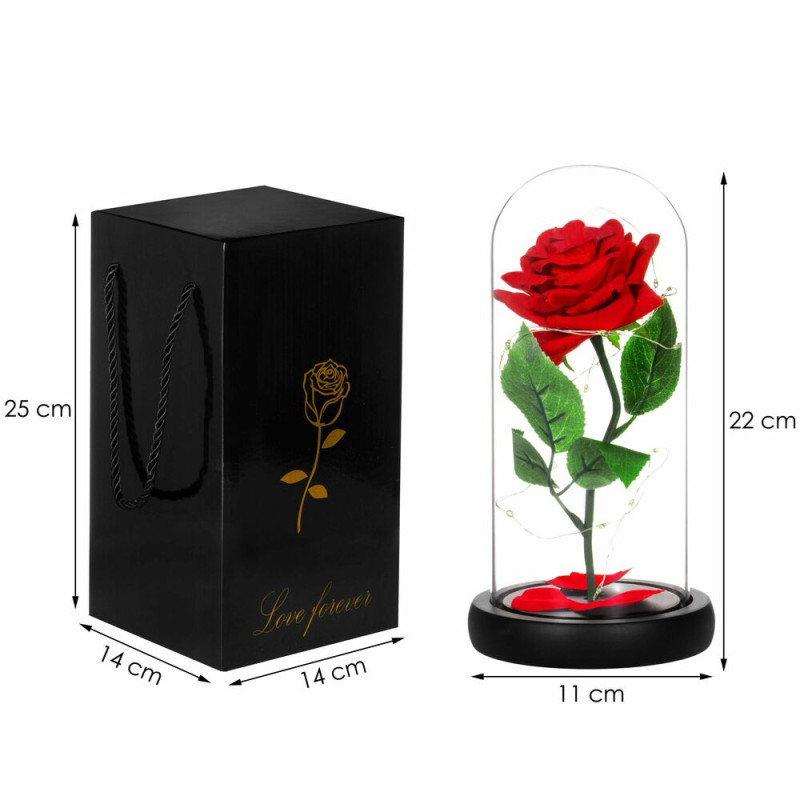 Květina ve skle je velmi detailně zpracovaná, díky tomu dosahuje realistického vzhledu. Díky LED světlům je krásně nasvícena, díky tomu se dá používat i jako lampička. Nemusíte ji udržovat, je vhodná pro alergiky. Ve skleněné nádobě je chráněna před prachem. Skvěle poslouží i jako dekorace do pokoje. V balení také najdete poukaz s květinovým motivem na který můžete napsat přání milované osobě.