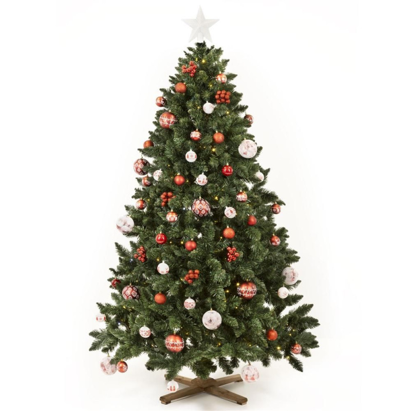 Prémiový umělý vánoční stromeček se zářivě zeleným jehličím imitujícím mladé lesní větve působí ultra realisticky a k nerozeznání od živého stromu. Husté a silné větve umožňují vytvořit plný tvar, který lze doladit díky možnosti modelování větví. Stabilitu zajišťuje masivní dřevěný stojan, v balení nechybí rukavice, balzám na ruce a textilní taška pro snadné uskladnění. Robustní, elegantní a šetrný k přírodě. Výška 240 cm, spodní šířka 150 cm, průměr stojanu 65 cm.