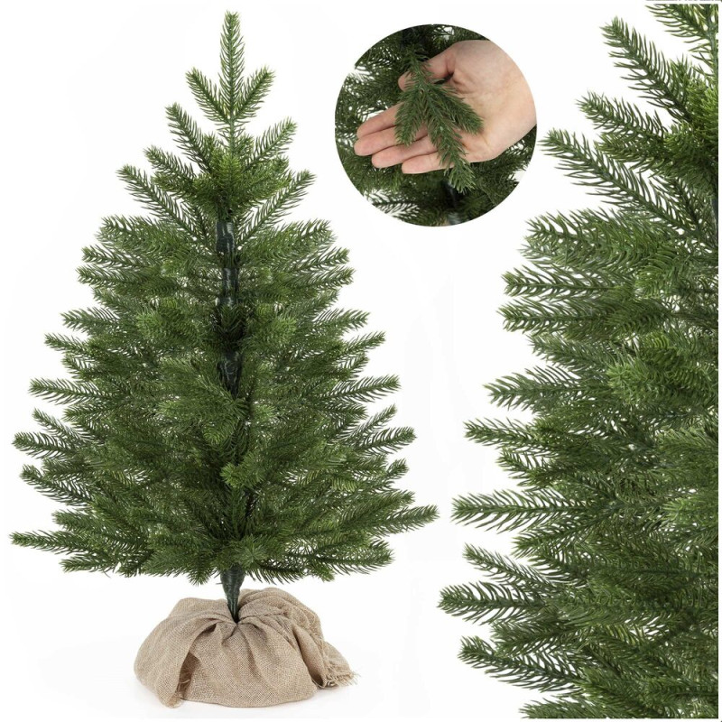 Vánoční stromeček s realistickým vzhledem kavkazského smrku zaujme detailním jehličím a dvoubarevnou fólií, která věrně napodobuje skutečné větve. Husté a rovnoměrně rozložené větvičky vytvářejí elegantní siluetu, zatímco kulatý dřevěný stojan obalený pravou jutou dodává přírodní vzhled i stabilitu. Díky kompaktní velikosti je ideální na stůl, komodu či do menších prostor. Výška 60 cm, šířka 38 cm.
