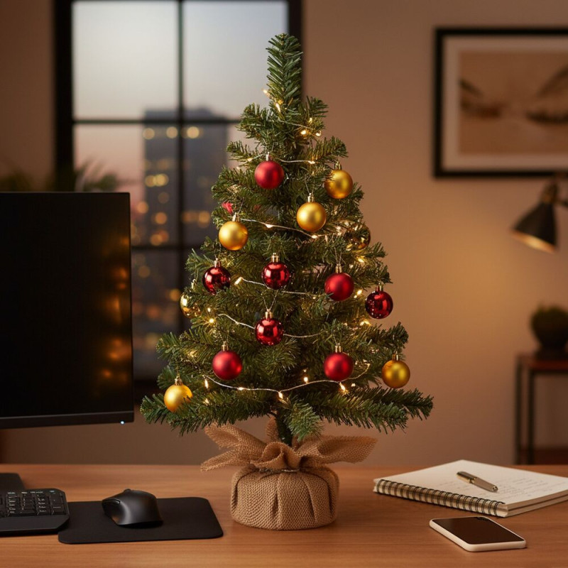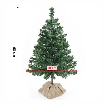 Vánoční stromeček s přirozeným vzhledem borovice zaujme hustým a rovnoměrně rozloženým jehličím, které působí velmi realisticky díky dvoubarevné fólii věrně imitující skutečnou větev. Stabilitu zajišťuje kulatý dřevěný stojan obalený pravou jutou. Díky kompaktní velikosti je ideální na stůl, komodu nebo do menších prostor jako elegantní vánoční dekorace. Výška 60 cm, šířka 38 cm, průměr stojanu 10 cm.