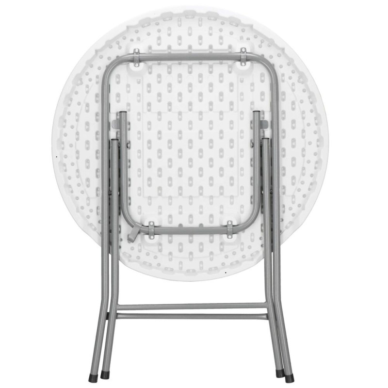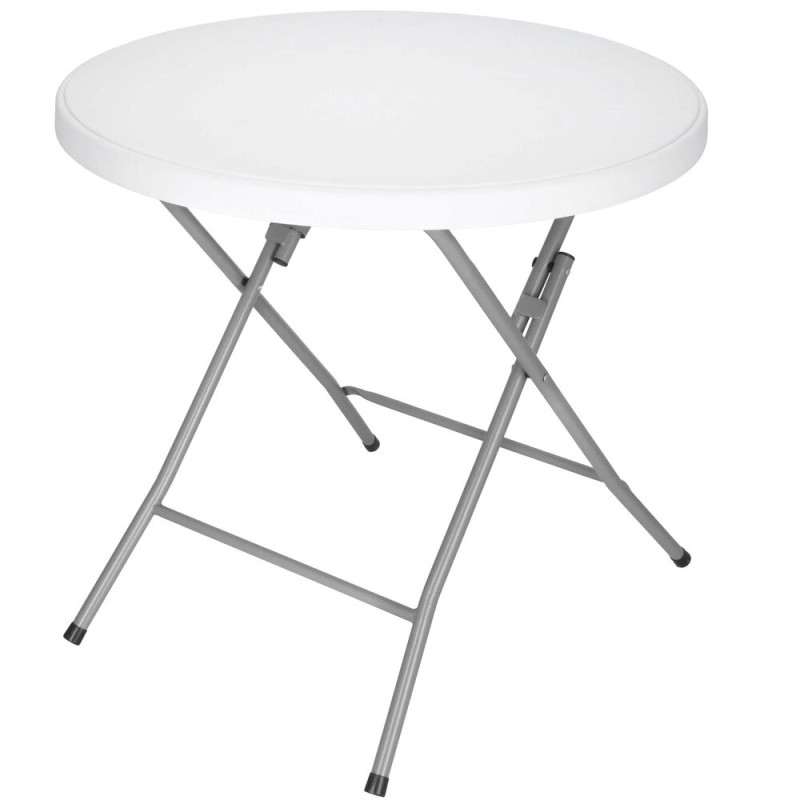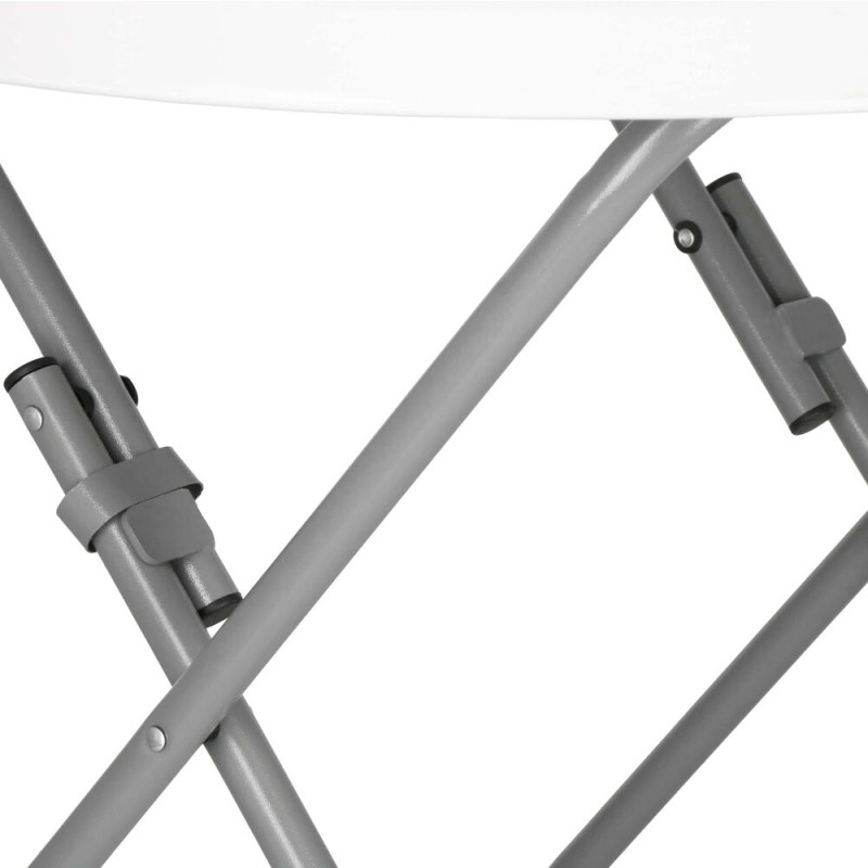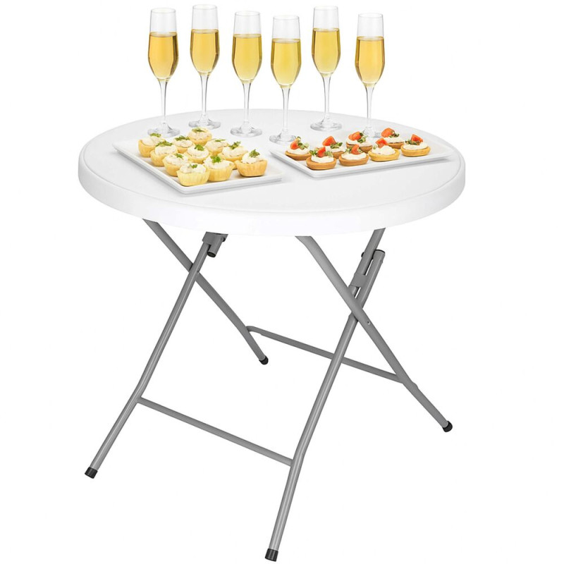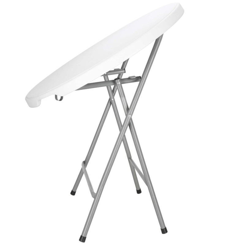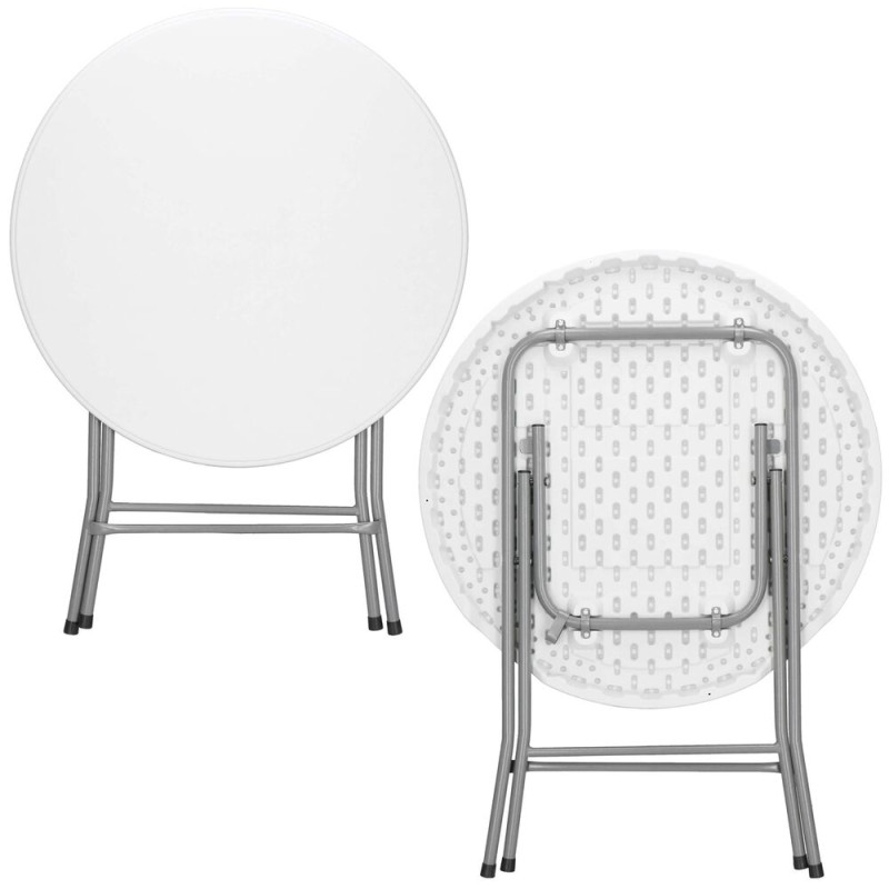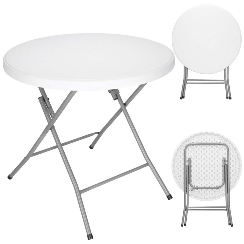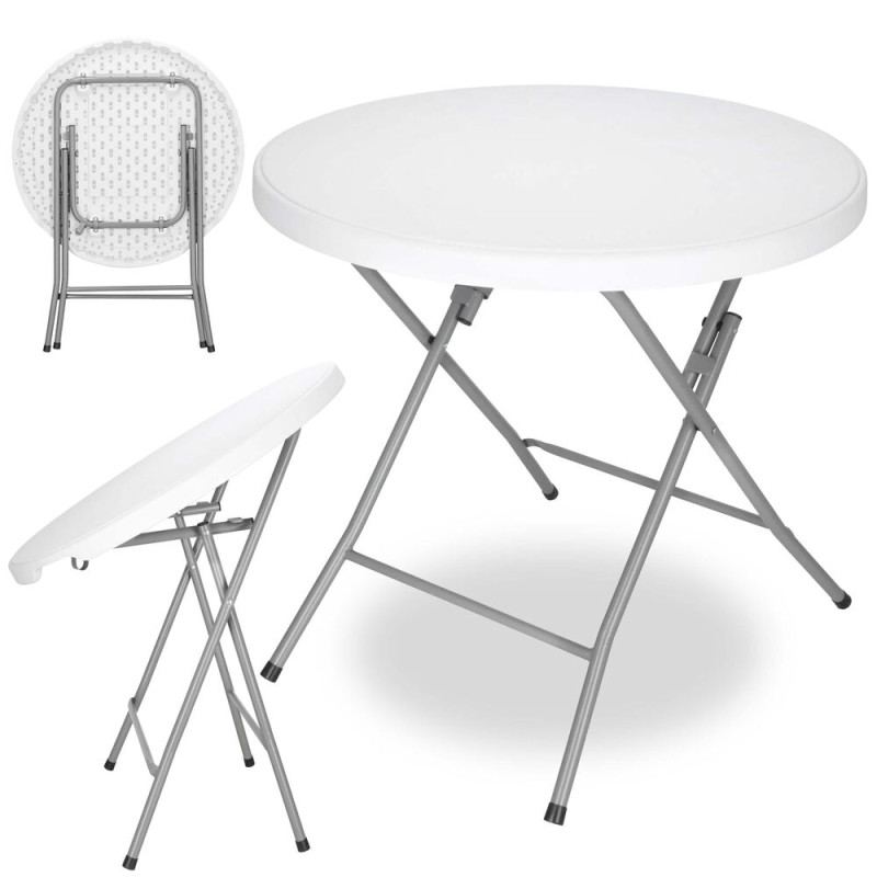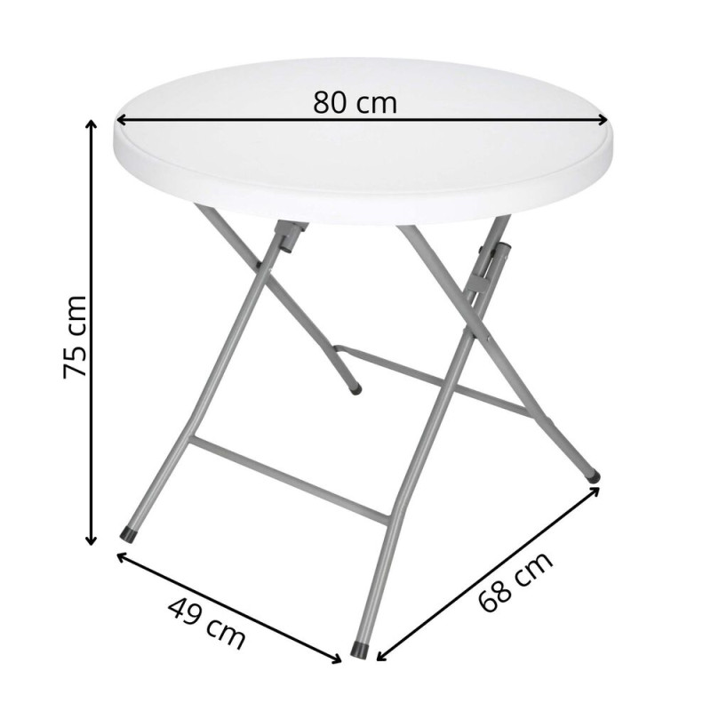 Základní údaje: Značka: Springos®. Materiál: HDPE, kov. Barva: bílý vršek, šedý rám. Typ: cateringový stůl, banketní stůl. Tvar horní části: kulatý. Maximální nosnost: 75 kg. Rozměry: Průměr desky stolu: 80 cm. Celková výška: 75 cm. Tloušťka hrany desky stolu: 4,5 cm. Délka nohavic: 95 cm. Tloušťka konstrukční trubky: 19/26 mm. Vzdálenost mezi nohami: 49 / 68 cm. Rozměry ve složeném stavu: 80 x 112 x 4,5 cm. Další informace: Protiskluzové podložky na nohou. Snadné skládání a rozkládání. Zajišťovací prvek nohy stolu.