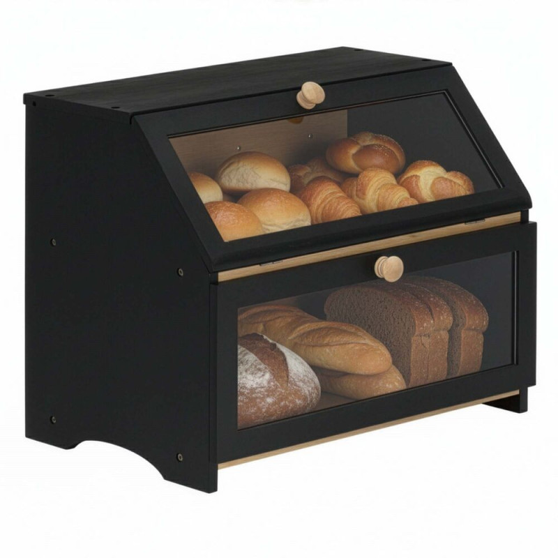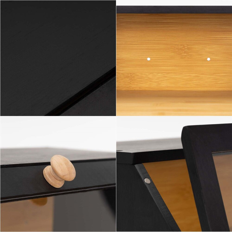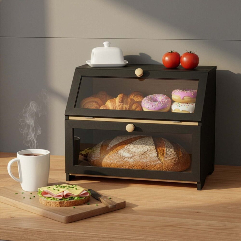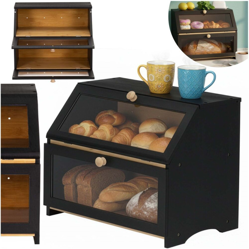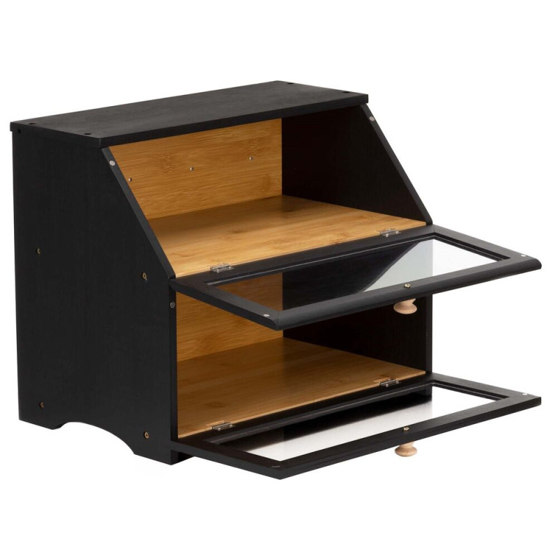 Základní informace: Značka: Springos®. Barva: přírodní bambus, černá. Materiál: bambus, průhledný akryl. Rozměry: Celková šířka: 39 cm. Celková hloubka: 25 cm. Celková výška: 32 cm. Tloušťka okraje: 1 cm. Šířka okna: 34 cm. Výška okna: 11 cm. Průměr rukojeti: 2,5 cm. Tloušťka rukojeti: 1,5 cm. Vnitřní rozměry police: 37 x 22 x 1 cm. Vnitřní výška spodní police: cca 15,5 cm. Vnitřní výška horní police: cca 11,5 cm. Šířka bočních rukojetí: 12 cm. Výška bočních úchytů: 2 cm. Další informace: Zářezy jsou umístěny po stranách chlebníku a slouží jako rukojeti pro snadnější přenášení výrobku.. Magnetický zavírací systém. Výrobek schválený pro styk s potravinami. Produkt vyžaduje svépomocnou montáž. Montážní sada je součástí ZDARMA.