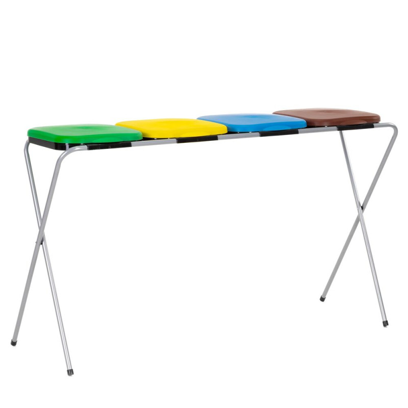 Základní údaje: Značka: Springos®. Materiál: kov, PP. Barva rámu: šedá. Barvy krytu: zelená, žlutá, modrá, hnědá. Počet přihrádek: 4. Maximální nosnost: 30 kg. Rozměry: Celková šířka: 128 cm. Celková hloubka: 42,5 cm. Celková výška: 74 cm. Průměr konstrukčních profilů: 1,5 cm. Šířka mezi nohama: 120 cm. Hloubka mezi nohama: 39 cm. Výška krytu: 35,5 cm. Šířka potahu: 29,5 cm. Tloušťka hran krytu: 0,2 mm. Další informace: Protiskluzové krytky na nožičkách.. Kryt má vnitřní přítlačnou klopu, která drží tašku na místě.. Kryt se montuje pomocí zacvakávací rukojeti.. Stabilní a lehká konstrukce..
