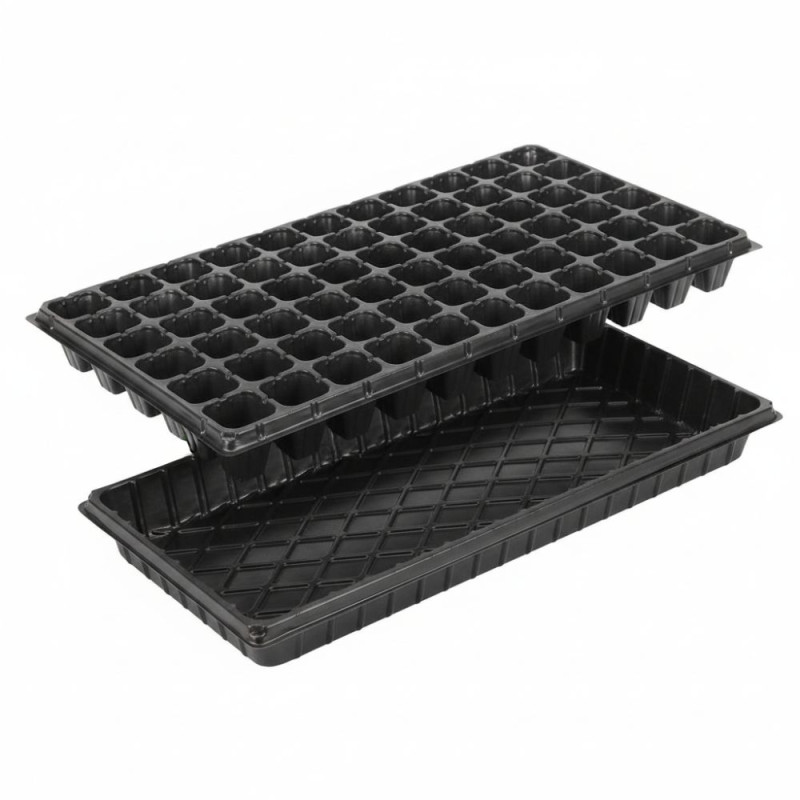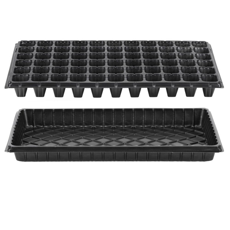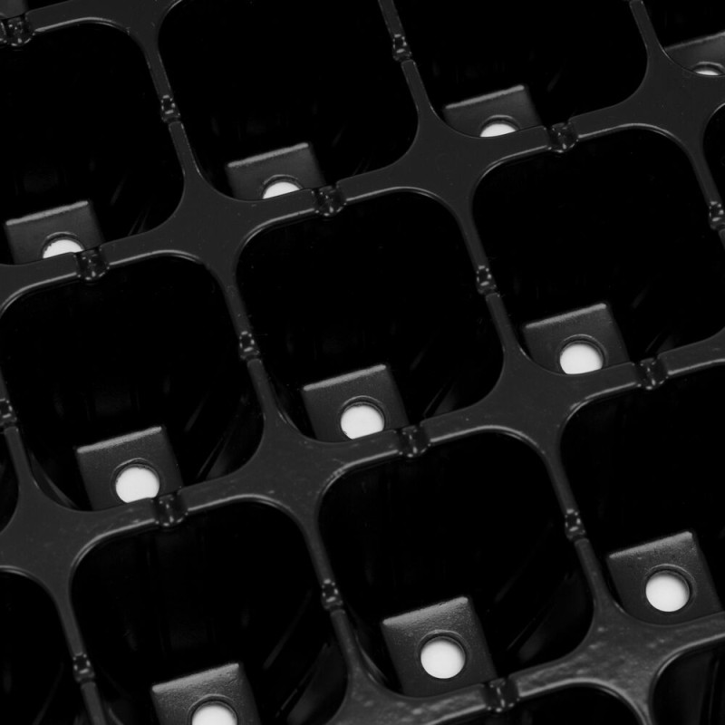 Plastový sadbovač se 66 samostatnými přihrádkami a spodním zásobníkem, vyrobený z odolného plastu v černé barvě. Obdélníkový tvar umožňuje přehledné uspořádání a snadnou manipulaci. Je určen k výsevu semen, předpěstování sazenic a zakořeňování mladých rostlin, přičemž zásobník zachytává přebytečnou vodu a usnadňuje zálivku.