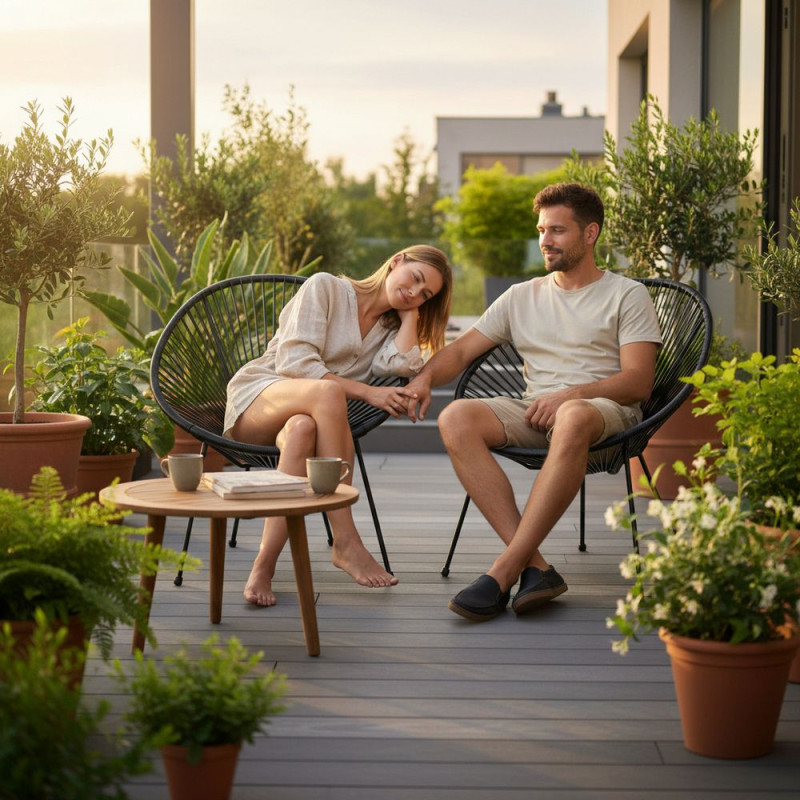 Křeslo je vyrobeno z materiálu, který neabsorbuje vlhkost a nezahřívá se na slunci, což zajišťuje pohodlné používání i během horkých dnů. Pevná konstrukce a snadná údržba z něj činí praktickou volbu pro každodenní použití v exteriéru.