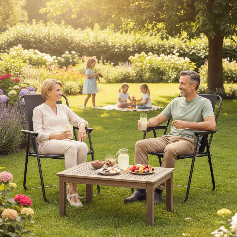 Křeslo je určené pro venkovní použití. Stabilní kovová konstrukce i pevný textilní sedák jsou odolné vůči povětrnostním vlivům. Nosnost křesla je 100 kg.