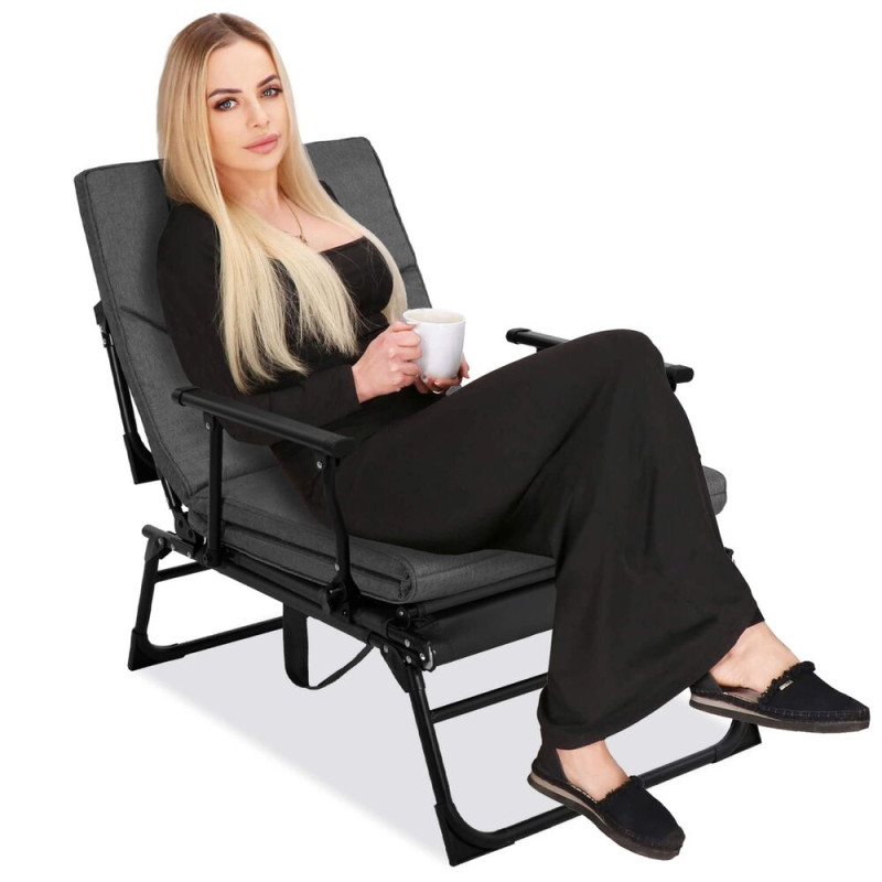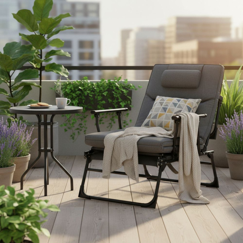 K pohodlí přispívá silný podsedák, opěrka hlavy a zaoblené rukojeti, které poskytují ergonomickou oporu těla a zvyšují komfort při delším sezení či odpočinku. Stabilní kovová konstrukce zajišťuje pevnost a odolnost při každodenním používání, přičemž nosnost 120 kg umožňuje bezpečné využití pro většinu uživatelů.
