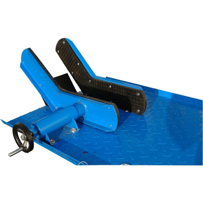 Zvedací plošina na motorky do 560 kg. Celoocelová konstrukce, 2 otočná a 2 pevná kolečka, podstavec ze čtyřhranu, plošina z ocelového rýhovaného plechu, pohodlné zvedání a spouštění pomocí nožního pedálu. Upevňovací čelisti na přední kolo do 180 mm, upevnění prostřednictvím ruční kliky.